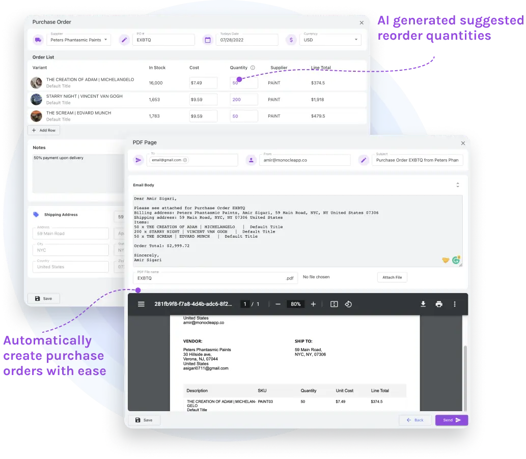 Inventory forecasting tools via automated purchase orders creation, enabling efficient replenishment and management of shipments.